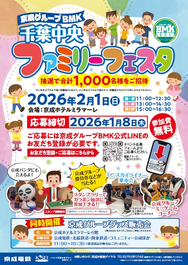 抽選で1,000名が参加できるらしい「京成グループBMK千葉中央ファミリーフェスタ」は、京成ミラマーレの京成ホテルミラマーレ 6階ローズルームで開かれますが、その応募締切は1月8日となっております。