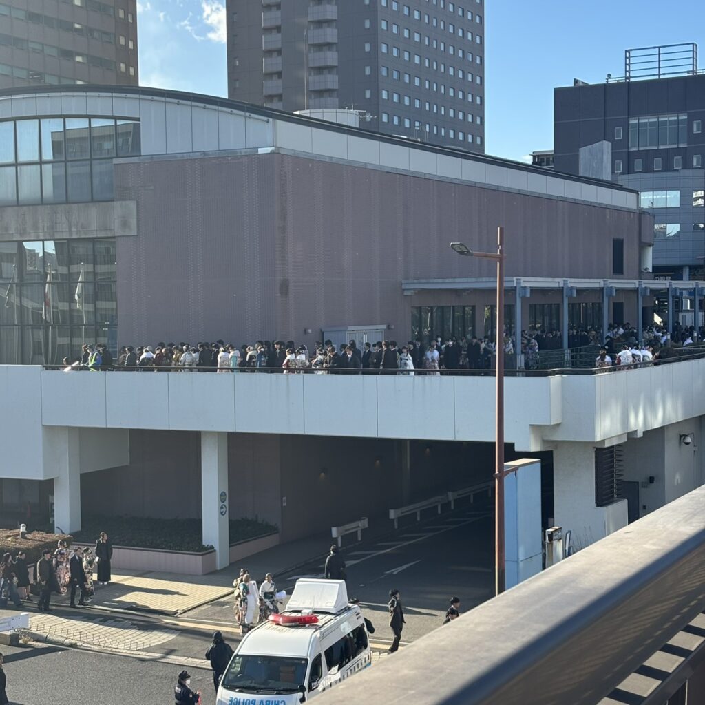 さらに近づいてみると、振袖やスーツ姿の新成人、付き添いの家族や写真撮影をする人たちで、歩くのも少し大変なくらいの混雑でした。