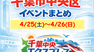 イベント 【イベント】今週末の千葉市中央区イベントまとめ(4/25(土)~4/26(日))【千葉駅・千葉中央駅】 今週4月25日(土)~4月26日(日)に千葉市中央区・千葉駅~千葉中央駅周辺で開催されるイベントをピックアップしています。さらに、番外編にて話題の新店も紹介していきます。お出かけ先候補に検討してみてはいかがでしょうか。では、まず今週末のイベ... 2026.04.24 イベント