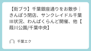 イベント 【街ブラ】千葉銀座通りをお散歩|きんぽう閉店、サンクレイドル千葉Ⅲ状況、わんぱくらんど開催、他【葭川公園/千葉中央】 最近、千葉銀座通りをぶらっとお散歩して、気づいた変化がありました。街ブラのメモとしてまとめておきます。【閉店】「和風らーめん きんぽう」が昨年11月末に突然閉店していた銀座通り沿いにあったラーメン屋さん「きんぽう」が、2025年11月29日... 2026.01.11 イベントグルメ街ブラ開店・閉店