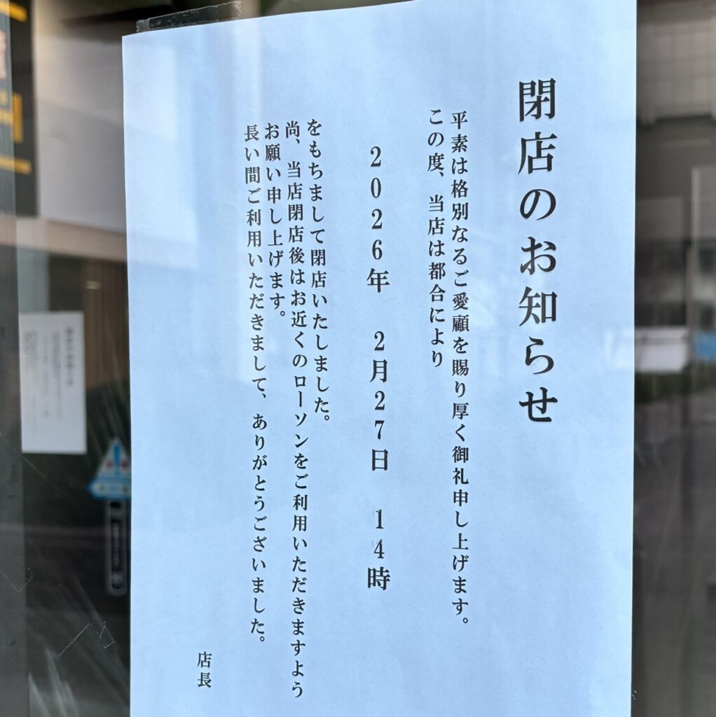 ”当店都合により2026年2月27日 14時をもちまして閉店いたしました。”とあります。