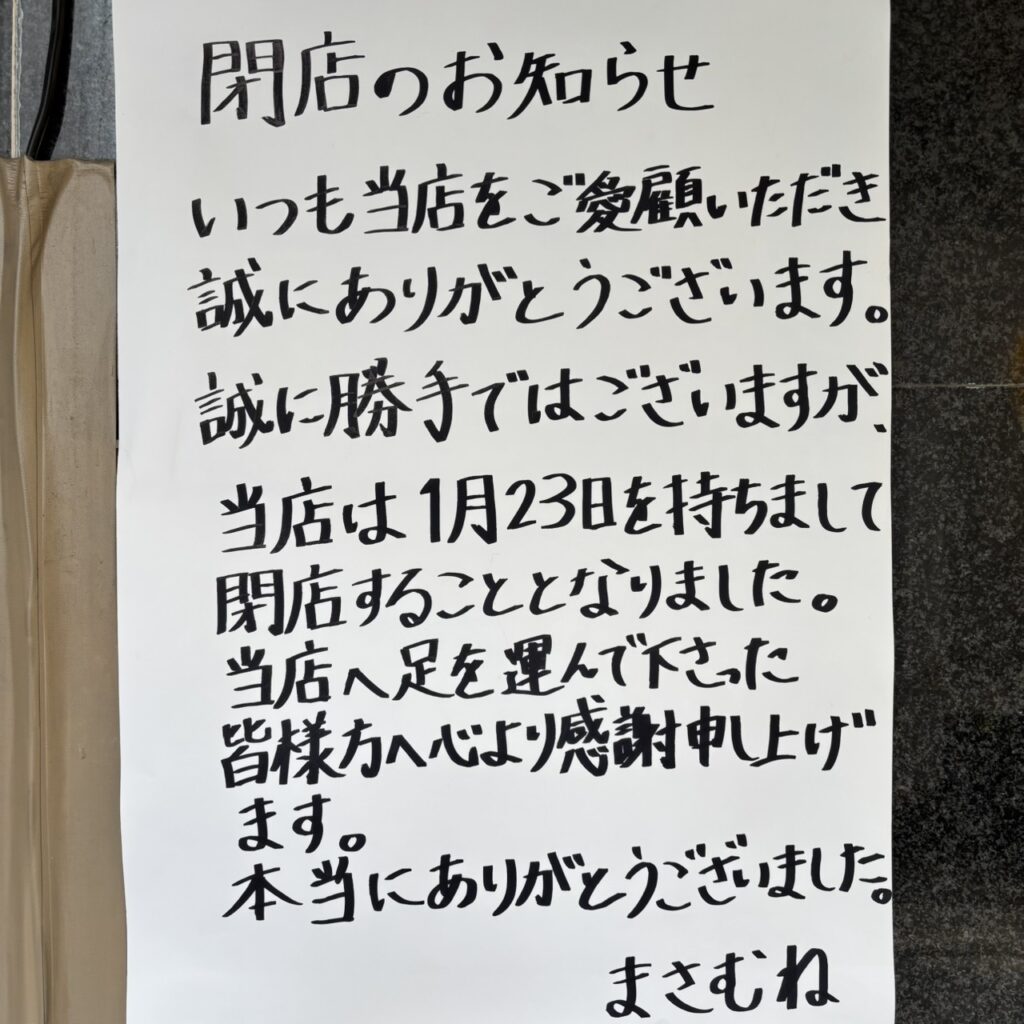 そんな「まさむね」ですが、既に2026年1月23日(金)に閉店済みです。