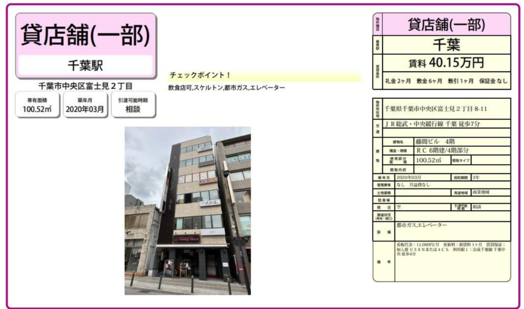 当時の4階の場合、40.15万円/月=1.3万円/坪くらいの感じですね。