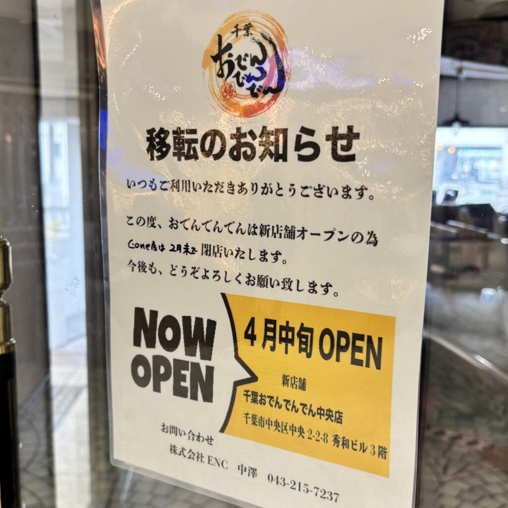千葉市中央公園前「おでんでん 千葉中央店」が移転のため、2026年3月閉店するようです。