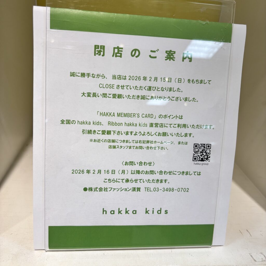 そごう千葉6階にあった子ども服店「hakka kids(ハッカキッズ)そごう千葉店」は2026年2月15日に閉店済みです。