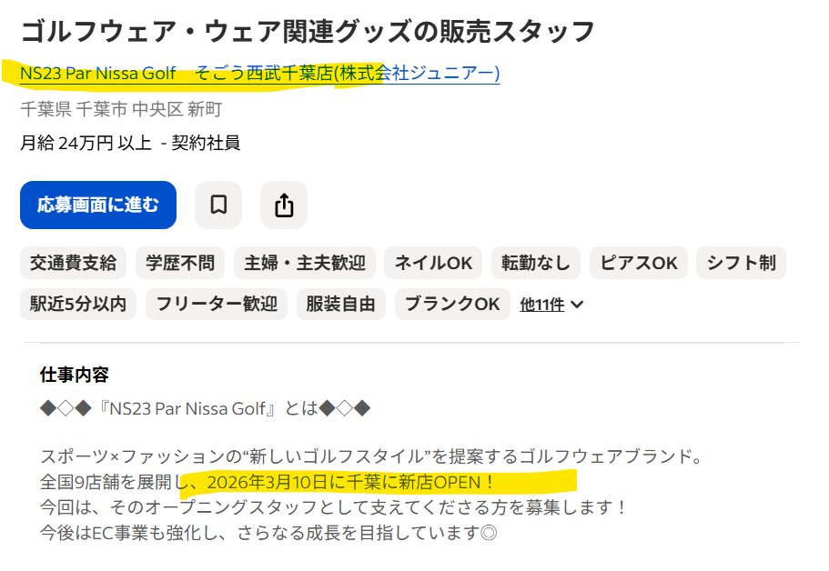 - 店舗名(開店予定):NS23 Par Nissa Golf(ニッサゴルフ)そごう千葉店